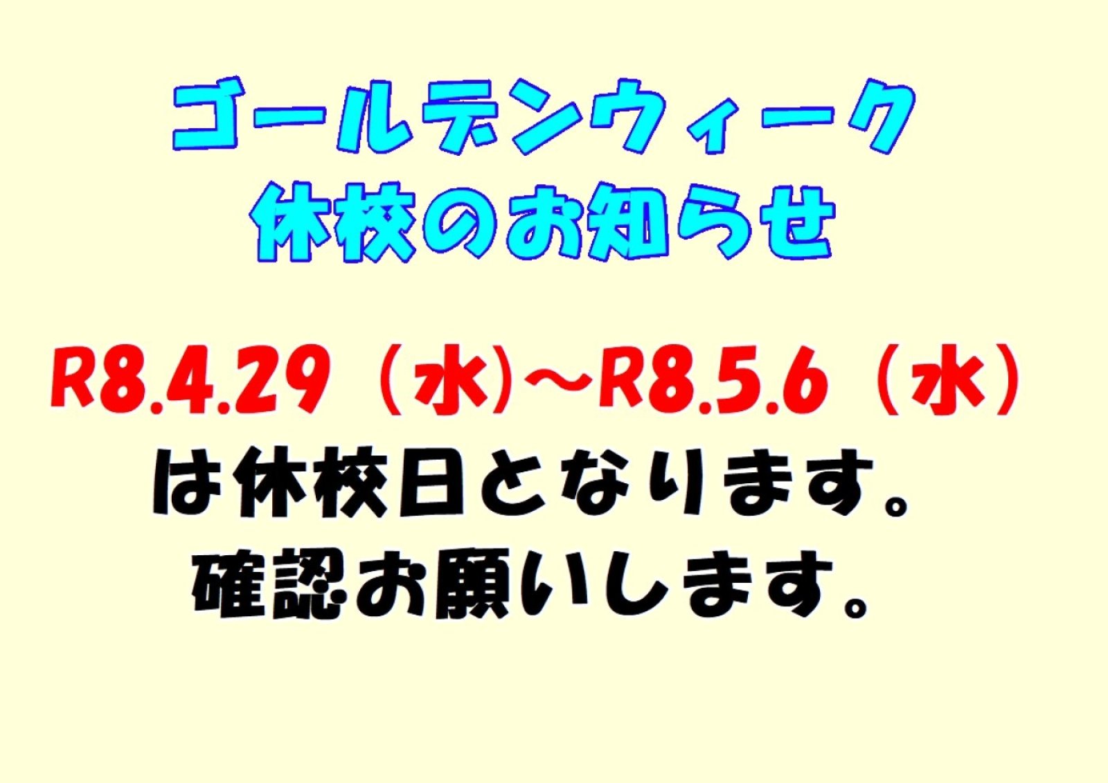R8.4.29(水)~R8.5.6(水)は休校日となります。確認お願いします。